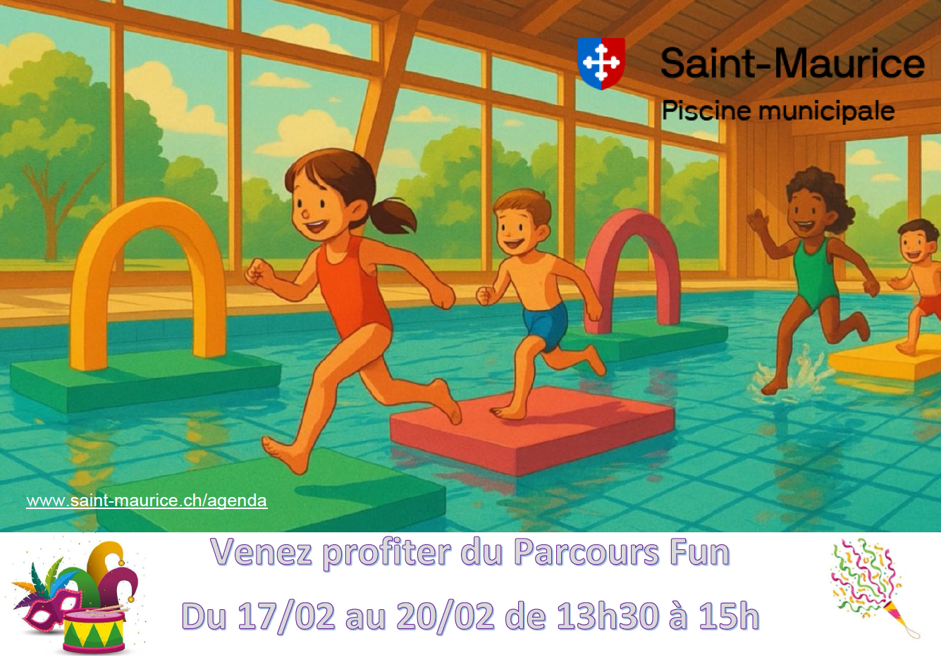 Durant les vacances de carnaval, du 17 au 20 février 2026, venez profiter du parcours fun à la piscine de Saint-Maurice, de 13h30 à 15h00.